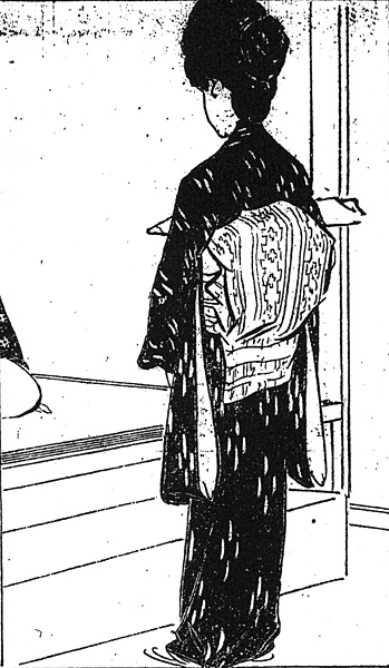 | キーワード | 後ろ姿;銘仙飛白;白博多の帯;襦袢の袖 |