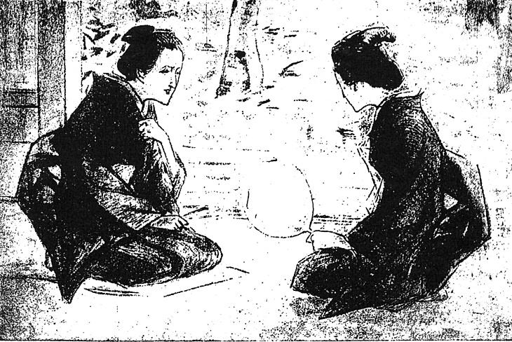 | 説明 | 五十をすぎたくらいの年頃の姉と妹が、戸障子を開け放った夏座敷の縁側近くで、うちわや扇子を使いながらひとの噂をしている。日本の夏は縁端のこういう場所がいちばん過ごしやすく、端居(ハシイ)と呼んだ。薄縁(ウスベリ)を敷き、扇子を手にしている左側が訪れた姉だろう。その片方の手が襟にかかっているのは、手持ちぶさたのときの手の遣り場のひとつ。きものの着付けはいつも襟元が気になるもの。二人とも初老の人妻の小ぶりな丸髷。もうすこし小さくなると慈姑(クワイ)などと呼ぶが、そこまでまだ小さくない。(大丸 弘) |