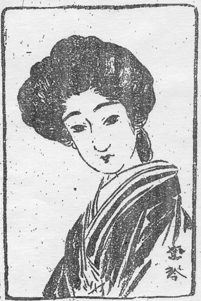 | 説明 | 二十歳をいくらも過ぎていないがひとの世話になっている女。この時代、お妾は自分のことをこう言った。相手は郷里に女房も子もある男で、いっときの相手とたがいに割り切っている間柄。女はいままで丸髷だったが、気を変えて束髪に結ったところ、「矢張り、そういう方が細君らしく見えるね」と誉められたので、それからは束髪でいることにした。女は「一度この髪で写真を撮っておきたいわねえ」と言っている。10(2)の挿絵では、丸髷から束髪への転換期の様子がわかる。束髪の髱(タボ=後ろ髪)がひどく長い。まだ丸髷のときに、女はタボを長くしていた。髱を長くする方が粋に見えるので、商売上がりのこの女は、そのくせが束髪になっても続いているらしい。10(5)で、外で出逢った幼なじみの男を、「マントの下に絣の羽織を着た書生風の二十一二の青年」と書いている。二重外套はマントとは構造が違うが、ザツな言い方ではこうも言ったのだろう。(大丸 弘) |