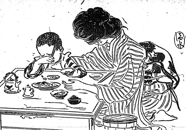 | 身装画像コード | H10:[家族の食卓;カンバセーションピース;アンティミスト] D2hi:[束髪(庇髪など、後期平型の)] D2:[ヘアスタイル] D3ob:[帯の締め方;帯の位置] D011:[男の幼児(だいたい就学以前)] Wmae:[前掛;エプロン;割烹着] |