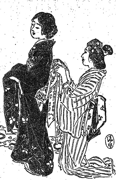 | 説明 | 卒業式翌日に父兄招待のお祝いの会をする例になっている某女学校、これが恒例の嫁選びの会になっているとあって、どの家庭でも娘を飾り立てるのに大苦労。この娘の場合は、「何処までも上品に、華族の娘らしく扮(ツク)りたい。頭は高島田にしようか、いやそれよりもあの子は頭を真ん中から分けて両方に毛を垂らし、ダイヤ入りの帯をさした方がハイカラで好い、頭はそれでいいとしてさて着物は(……)」。額の上を割る髪型は、前髪があってはできないから、日本髪の時代にはありえない。束髪が一般的になり、その変化が生じてきてから、ぽつぽつと現れだす。1912(大正元),1913(大正2)年頃からのこと。(大丸 弘) |