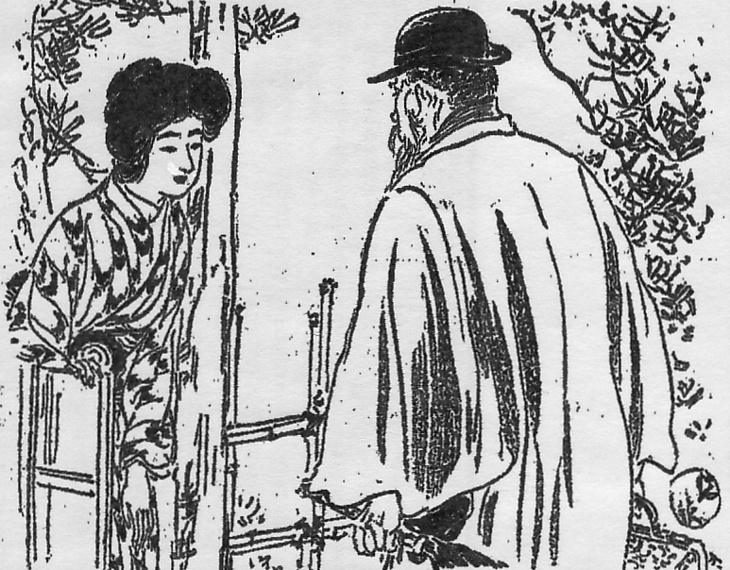 | 説明 | ひさしぶりに地方から出郷して、東京の嫁や孫たちの住む家を訪れた老人。「埃染みた山高帽に、藍鼠の薄外套(インバネス)、その下から光沢気(ツヤケ)のない袴が見える。(……)小倉の白い鼻緒のついた日和下駄、(……)花毛氈のような模様の鞄を式台にドサリと置き(……)」、そして左手に洋傘(コウモリ)を持った風体が、挿絵に忠実に描かれている。二重外套は和服の上にも洋服の上にも用いられるので、もちろん袴とともにも着用されるが、すくなくとも東京では羽織袴に二重外套を着ている人はあまりいない。祖父に向かい合っているヒロインの束髪は大きくて、額も頬も暑苦しそう。襦袢の襟元をまるでTシャツのように着ているのが同様な印象。(大丸 弘) |