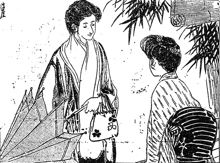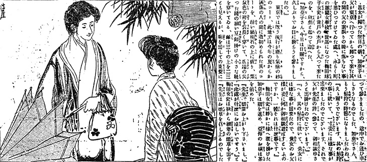 | 説明 | この挿絵はおそらく画家の勘違いで、右側と左側の女性の髪型を取り違えている。「廂(庇)(ヒサシ)をだしての束髪にセセッション式の擬(マガ)い真珠の模様が入った後櫛もけばけばしい」とあるのは左側の、訪問してきた女学校の先生でなければならない。時折あることで注意が必要。(大丸 弘) |