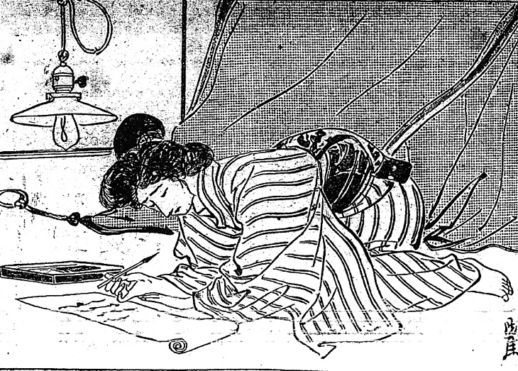 | キーワード | 竪縞のきもの;お太鼓結び;素足;腹這い;巻紙;毛筆;硯(すずり);吊りランプ;電気のコード;蚊帳 |