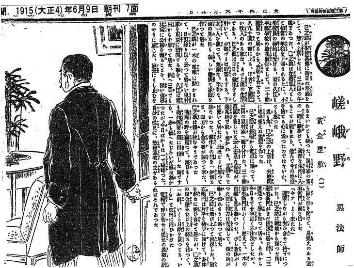 説明 〈黄金屋敷〉第1回は、小学校長という役職と、「低くても位階勲等を持っている」人間、としての格式にしたがった正装はフロックコート。訪問先は従兄の屋敷だが、長いあいだ無沙汰だったという遠慮の心持ちもあろう。〈妻と兄〉第1回はそれからしばらくして帰郷した場面。「今まで被ったことのないパナマの夏帽子を被って、(……)風俗が見違えるほどハイカラになって、意気な洋服に、金色の時計の鎖を下げて居た」すがたは背広。日本画家である挿絵の石井滴水の描いた背広は、肩芯は表現しているものの、毛筆の癖もあって、身体にフィットしていない無意味なシワが目立つ。芍薬の花束を持って挨拶している娘の髪は島田。(大丸 弘)