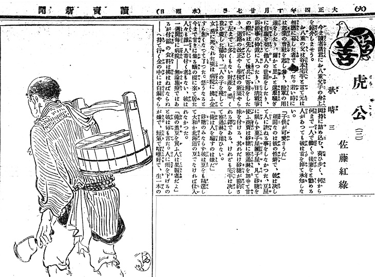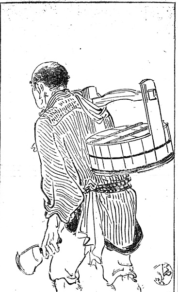 説明 煮豆売りの老人。この時代は振り売りの数も種類も非常に多く、落語の材料にもなっている。振り売りの多かったのは、この話の通り、ちょっとの才覚と辛抱とで、だれにも取っつきやすい、ほとんど元手入らずに近い商売だったためもあるだろう。この煮豆屋のように飯台一つを肩に担ぐのは少なく、たいていは荷物を二つに分けて天秤で吊って呼び歩いた。米や薪炭、野菜といったもの以外の惣菜類は、ほとんどはこの振り売りの商品で間に合った。(大丸 弘)