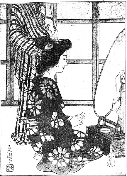 説明 湯上がりの姉と妹の対話が延々と続く。こういうシーンには挿絵画家は頭を痛める。しかし、描かれている人物が若い美人ででもあれば、読者は毎日毎日同じような画面が続いてもけっこう喜んでいたかもしれない。挿絵の星野更園女の描く女性には、同じ日本画家でも、確かに前時代の狐顔の女とはちがう、手応えのある肉感がある。(大丸 弘)