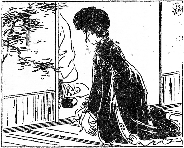 | 説明 | 卒業式の日の女学生。第1回は仲良しの三人が、修業半ばで学校を去ってしまった級友の噂をしている。第3回はその中のひとり――挿絵では右側に立つ娘が、卒業証書を見せるために、来客と囲碁の最中の父の部屋を訪れたところ。三人とも髪は思いきり大きな束髪。載っている髷もけっして小さくはないのだが、全体が大きいのと、髷が平らなためにあまり目立たない。その髷の後ろ、根のあたりに輪櫛を挿すのがふつうで、もうひとつの花簪(カンザシ)を前、横に挿す人が多いが、もちろん決まっているわけではない。中の一人が、「瓜実顔の廂(庇)(ヒサシ)を思いきり前に突き出したのが(……)」 とあるように、束髪のかたちは百人百様といってよい。卒業は満十六歳が標準だから、まだ誰のきものにも子どもの標(シルシ)の肩揚げがあり、エピソードの中心が彼女たちの結婚話なのが可哀相のよう。(大丸 弘) |