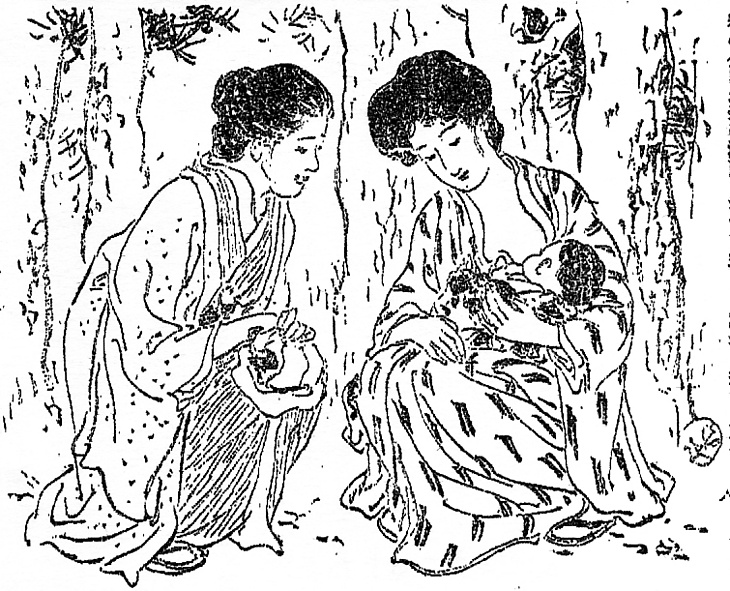 | 説明 | 若い女性の方は赤ん坊を支えるため片膝を立て気味だが、母親の方はふつうのうずくまり方だ。欧米人はこういう屈み方をあまりせず、中近東から東南アジアの風習として蔑視する見方もあった。もっとも、大相撲の立ち合いでは蹲踞(ソンキョ)と呼んでいて、なかなか堂々と見える。母親の束髪は、廂(庇)(ヒサシ)はほとんど出ていない平べったいだけの古風なタイプ。娘は「上品な廂髪(ヒサシガミ)に凡て黒ずんだ櫛や髪留(ヘヤピン)を挿し」とあり、髷が大きく盛り上がっていて、廂にも髷にもおそらくたくさんのアンコ――梳き毛、が入っていて、一見女優髷に近くさえ見える。(大丸 弘) |