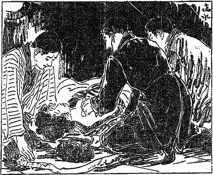 | 説明 | 北陸の廻船問屋の娘としてなに不自由なく育ちながら、一歩水商売の世界へ足を踏み入れたため、その器量のよさがかえって仇となり、転落してしまった妹。いま船内で古毛布にくるまれ、危篤の状態にいる。「身につけた着物も縞銘仙の下品な綿入で」、むかしの面影のないみすぼらしさ。医者はフロックコートで膝を突き、聴診器を病人の胸に当てている。フロックコートは医師の仕事着でもあったらしい。かたわらに小さな黒い革鞄。これは万国共通の医師のシンボルだが、その時代、高利貸もよくこれを持たせられていた。(大丸 弘) |