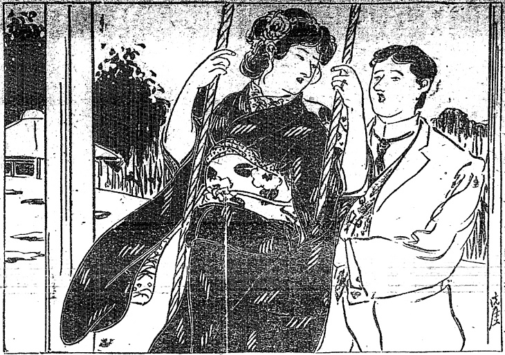 | 説明 | ブランコに乗っているのは、もと大名華族の別邸だったというこの豪邸の夫人の姪。この娘の髪は「女優巻に結んだ髪が頸の所でパクリパクリと躍る」。女優巻はすでに1911(明治44)年の新聞に「女学生の流行――ローマ巻に大きなリボンは廃って、女優巻や昔風の桃割」とあるくらいだから、トップモードというわけではない。(大丸 弘) |