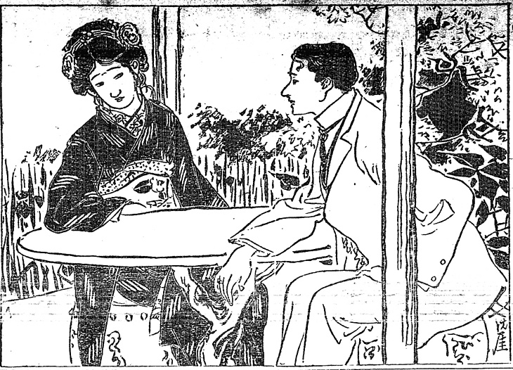 | 身装画像コード | D7re:[令嬢モデル] D004:[適齢期の娘;新造;(1) 嫁入り前の娘,新妻,さらに一般の他家の妻女をいう。] D014:[若い男(20歳前後~30歳前後)] D2hi:[束髪(庇髪など、後期平型の)] D2sit:[七三;女優髷] D1ka:[髪飾り(櫛,簪,リボン)] Vhan:[半襟] Vob:[帯] Wne:[ネクタイ;ネックバンド] D6se:[洋装;西洋化;西洋観;ハイカラ;西洋かぶれ;開化ぶり;西洋憧憬] |