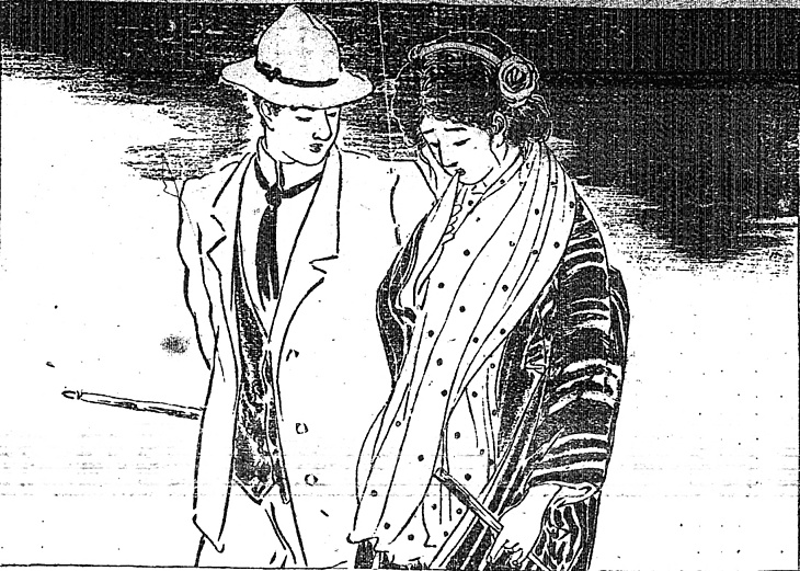 | 身装画像コード | D7re:[令嬢モデル] D004:[適齢期の娘;新造;(1) 嫁入り前の娘,新妻,さらに一般の他家の妻女をいう。] D014:[若い男(20歳前後~30歳前後)] D2hi:[束髪(庇髪など、後期平型の)] D2sit:[七三;女優髷] D1ka:[髪飾り(櫛,簪,リボン)] Wku:[頸覆い(マフラー,ストール,襟巻,ショール)] Wbo:[かぶり物一般;帽子] Wne:[ネクタイ;ネックバンド] D6se:[洋装;西洋化;西洋観;ハイカラ;西洋かぶれ;開化ぶり;西洋憧憬] |