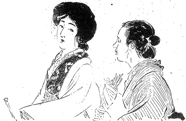 | 説明 | 鶴見の総持寺を訪れたこの辺りに住むふたりの女。墓参と見えてうしろに従う五十あまりの婆さんは、香華を手にしている。その婆さんと話しながら先を行くお嬢さんは、二十歳ばかりの、客待ちの車夫たちが見返るような美しい令嬢。令嬢の髪は自分でザッとまとめたような束髪、前の真ん中を割っているように見える。髱(タボ=後ろ髪)が襟につくほどのびているのがいくぶん古いスタイル。それでも若い人らしく、婆さんに比べても襟は抜いていない。きものの打ち合わせはごく浅く帯のすぐ上で開いている。春の浅いこの時期、お嬢さんは羽織を着ていて、つき添う婆さんは着ていない。外出のお供の下女はふつう羽織は許されない。下女の髪は島田のまったく崩れたもの。(大丸 弘) |