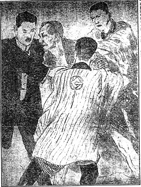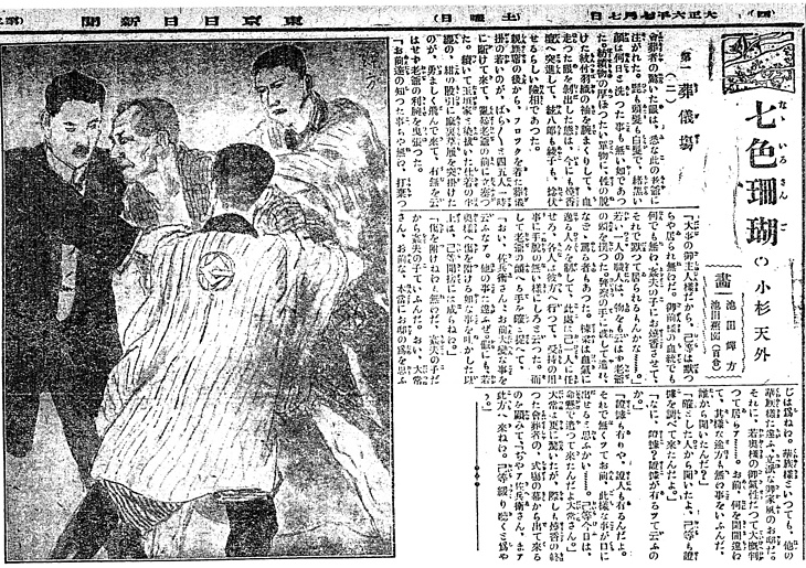 説明 政界にも知己の多い華族の葬儀に、言いがかりをつけに暴れ込んできた老人。このクラスの葬儀となると参列者の身なりは、「羽織袴にパナマ帽が多かった。中には爵位服、位階服の正装者も混じって、麗らかな初夏の日光は、肩章や勲章に眩しく反射した」とある。爵位服位階服といっているのは、勅任官奏任官等有位の高官について制定されたいわゆる大礼服で、一般人には、元朝の参内のほかは見る機会は滅多にない。「親族席の後ろから、フロックを着た葬儀係の若いのが、バラバラと四,五人一時に駆けてきて(……)」とあるように、洋服の場合はフロックコートがふつう。乱暴者に直接手をかけているのは、「玉垣家と染抜いた仕着の半纏の、紺の股引に麻裏草履を突っ掛けたのが、勇ましく飛んで来て(……)」とある。車夫や出入りの鳶(トビ)の連中だろう。(大丸 弘)