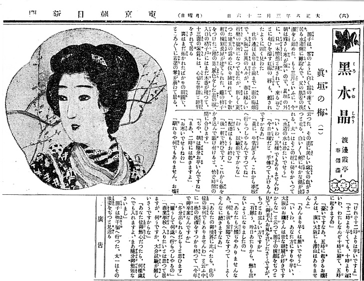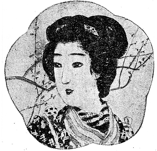 説明 昔気質の父親といくぶん偏屈な兄とを持つ数え十六の浪花娘。〈真垣の梅〉第1回の大首では、ヒロインが霜の凍てついた共同水栓の下、襷がけで父親の肌着を洗濯していると、苦学生の牛乳配達が声をかける。大阪市の中心部に水道の給水がはじまったのは二十数年も前の1895(明治28)年のことだったから、この物語の時点では二百万市民のほとんどは水道の水のお世話になっていた。もと郊外の梅畑を潰したという家賃十三円の新興住宅も、その恩恵には洩れていないが、東京もそうだったように、各戸配管はずいぶん遅れた。かなり長い間はそれまでの井戸水が水道水に変わったというだけで、相変わらず水汲み洗濯は共同の水道端まで行かなければならなかった。配達の男のいうように、水道水はこれまでの井戸水に比べて夏はあまり冷たくなく、冬は冷たかった。〈真垣の梅〉第8回では、隣家の二つ年上の娘にものを托している。十六にしてはませた感じなのは、母親がいなくて主婦代わりをしているせいかもしれない。大阪でももう隣の娘のように、若い娘は束髪を好んで結うようになっていたが、父親は新しいものを毛嫌いするので、娘は日本髪。十代半ばの娘は、唐人髷か、蝶々か、ふくら雀で、このどれでも前から見ると、このようにふたつの山が見える。画家・名取春仙の描く女性は一般に、この娘がそうであるようにはっきりした眼をしている。それが眼の縁に、化粧としてラインを描いたようにさえ見える。春仙が美人を描くときの筆癖で、うるさい父親が娘にそんなことを許すわけはなく、この点はこの時代の女性の眼としては、誤解を生むおそれがある。(大丸 弘)