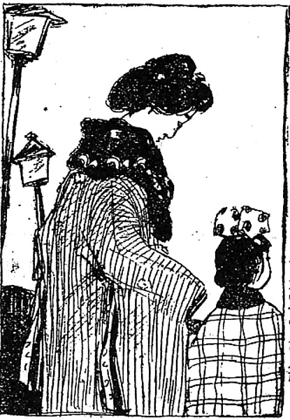 | 説明 | 夫の愛人が訪ねてきて、帰りがけに妻の見ている前で、家の八歳の女の子を連れて出る。子どもはその女の家に行ったこともあるので、なんとなくついて行く――という奇妙な場面。女はたっぷりしたコートを着て、髪は髱(タボ=後ろ髪)を大きく後ろへ伸ばしていて、あまり品の良い恰好ではない。このような髪を見ると、束髪のある種のタイプが、いかに日本髪に接近したかということがよくわかる。(大丸 弘) |