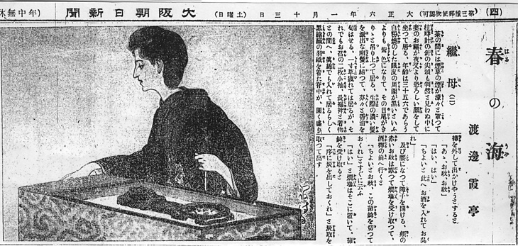 説明 凝った木目の長火鉢の前に座った奥様は三十五,六、「白粉焼けのした眼皮(マブタ)の周囲(グルリ)が黒いというより紫色」という描写は、この病的に我が侭で口喧しい女が、芸者あがりであることを暗示している。この女の髪は、「生え際の濃い髪を派手な廂髪(庇髪)(ヒサシガミ)に結って(……)」とある。見たところは、廂髪というほど前方が出ているわけではない。すでにせり出すような髪は流行から遅れていたため、この程度でもそう呼んだのだろうか。ただし、幡恒春の作画には一種の抽象的感覚があるので、鵜呑みにするのはためらうが。また、きものの襟と首のつき方が奇妙に見える。これはこの女が、二枚小袖と長襦袢の間に真綿を入れているためらしい。冬はまだ必ず綿入れを着たこの時代、箪笥の底に入れ残りの真綿があって、こんな寒さしのぎができたのだ。(大丸 弘)