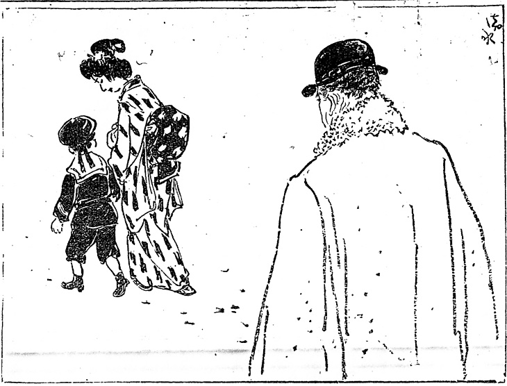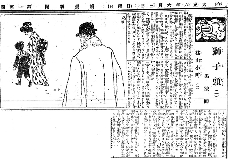 説明 大正期になると新聞小説の衣裳付けもだんだんと簡単になり、中にはほとんど欠いているものも出てくる。もちろんそれにはそれだけの理由がある。そういう中ではこの日の渡辺霞亭の風俗描写は、例外的と言ってよいくらいくわしい。それをまた石井滴水が忠実に再現している。舞台上の登場人物のイメージが鮮明になり、その一人一人の風俗が読む人にある程度の予見と期待を与える、まるで芝居でも見ているような、作者と読者の古風な関係と、約束のようなものがあるようだ。(大丸 弘)