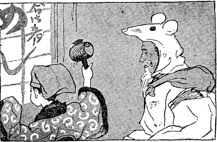 | 説明 | 北海道は北見海岸から、目指す故郷の千葉県までの長旅の途中で旅費が尽き、にわか芸人になって門付けをして回る親子。親切な人から踊りの手ほどきと衣裳を恵まれ、父親は白鼠の面と衣裳、幼い娘は大黒天の緞子の広袖と頭巾、打出の小槌という恰好で、行く先々の小料理屋などで、教わった福徳踊りを踊ってけっこう喝采を浴びた。楽しみの少ない開拓地の集落では、こんな他愛ない芸にも慰められる人が多かったのだろう。この種の物語の常で、親子の年が離れすぎている。娘の被っている頭巾は緋色で袋のように縫ってある抛(ホウリ)頭巾風。本来は舞台の役者の挨拶や祭礼に用いたもの。また本文には狩衣とあるが、娘の着ているのは広袖の半纏のようなもので狩衣ではない。(大丸 弘) |