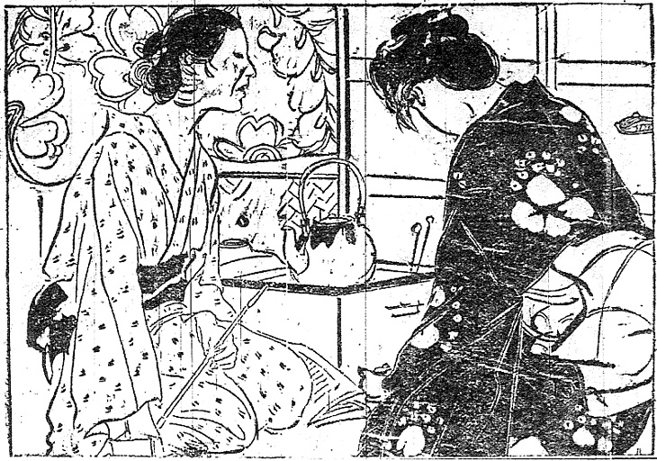 | 説明 | 老夫婦、その娘は夫に死に別れ、孫娘を連れて同居、この四人で二階借りの暮らし。夫婦は娘に再婚を勧め――むしろ強要している。その相手に、父親は大きな借財をする魂胆、という構図。「我が親ながら貞江は母の顔を悪鬼のように見た」という、襟をだらしなく抜き、少し膝を開いて、煙管を斜に構えた六十がらみの女を、画家の公文菊仙は少ないタッチでみごとに表現している。食うや食わずの老婆が髪結さんへ行って丸髷を結うはずはないから、首筋の髱(タボ=後ろ髪)めいたものも、小さな髷めいたもの、娘の束髪めいたものと同じに、もちろん手づくねだろう。老婆の眉については、この時代になってまだ眉を落としている婆さんがいたのか、という理解と、眉を描かない方が無機的な表情をあらわすことができる、という理解の仕方とがある。(大丸 弘) |