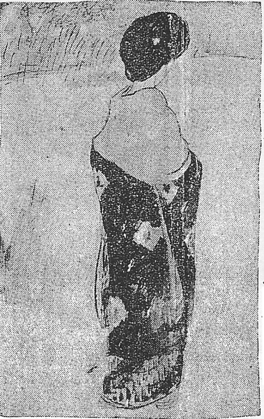 | 説明 | 東京郊外の晩秋の自然の中を散策する三人の男女。その中のひとりの娘は大きな花柄の羽織の上にすっぽりとショールを掛け、頭はあまり前の突きでてはいない廂髪(庇髪)(ヒサシガミ)の束髪。このころの若い女はこんな田園や林の中を歩くのでも、べっとりと白塗りをするのがふつう。しかし第45回で、この娘が眼の縁にラインを入れているのは、この時代としてはめずらしい。もちろんこれは紅ではない。紅をこんな風にさすのは踊りのときぐらいで、大人では笑いものになる。(大丸 弘) |
