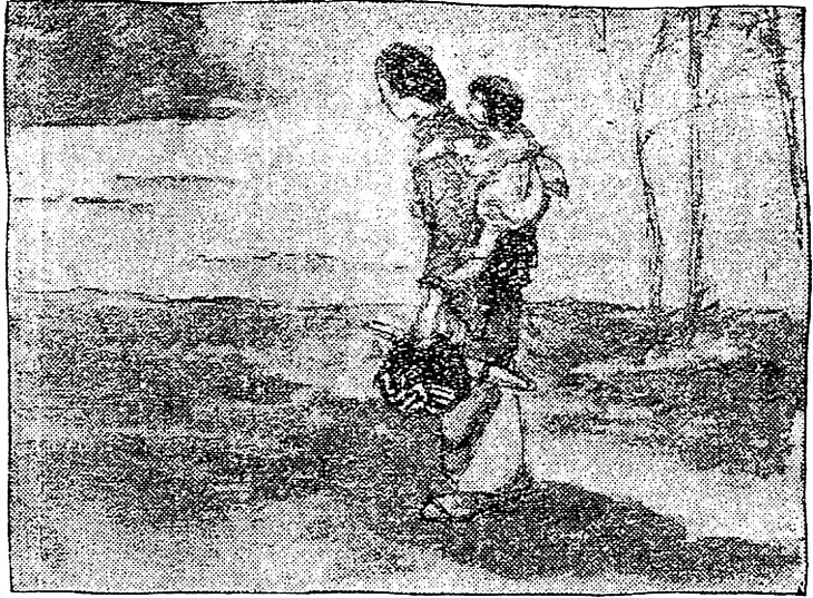 | 説明 | 孫を背負って買い物に行ってきたおばあさん。片手に大きな買い物の風呂敷包みと日傘を提げている。もちろん負ぶい紐を使っているが、小さな子だと、川でも渡るときのように、紐もなしにお尻に手を回して負ぶうこともある。乳幼児を背中に負ぶって保育する習慣に対しては、戦前、医学的立場からこれをやめるべきだという意見も、それに対する反論もあった。負ぶう人の髪型は負ぶわれる子にとっては一大事で、日本髪の大きな髱(タボ=後ろ髪)は子どもにとって迷惑だった。また髪を壊されてしまったと、髪結さんに来てこぼす女もいた。雇われの子守りっ子はたいてい鉢巻をしていた。これは髪をいじられるのを防ぐというばかりでなく、逆に子守りの後れ毛が、赤ん坊の目に刺さることがあるから、とも言われたため。(大丸 弘) |
