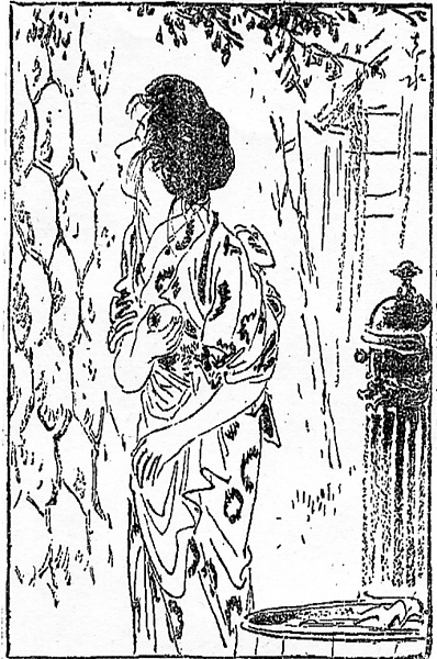 説明 崖下の裏長屋住まいの娘が、共同水栓のもとで洗濯をしていると、崖の上からテニスボールが落ちてきた。友人の邸内のテニスコートでゲームしていた若者が、ボールを追って屋敷裏の崖っぷちまで来ると、崖下でボールを握っていたのは子どものころの遊び相手だった、郷里の村の、もう永いこと会っていなかった娘だった、という場面。東京市の水道はもう二十三区のほとんどの地区に通じていたが、関東大震災(1923年)までは場末では各戸に配管されてなく、むかしの井戸が水道に変わっただけ、という共同水栓が多かった。貧しい暮らしの娘の恰好は、洗い晒しの紡績絣の袷に、色の褪めかかったモスリンの帯を締めて、赤いメリンスの細紐を襷にしていた。モスリンとメリンスは同じ。メリンスといえば安っぽくて派手なものの代名詞のようだった。(大丸 弘)