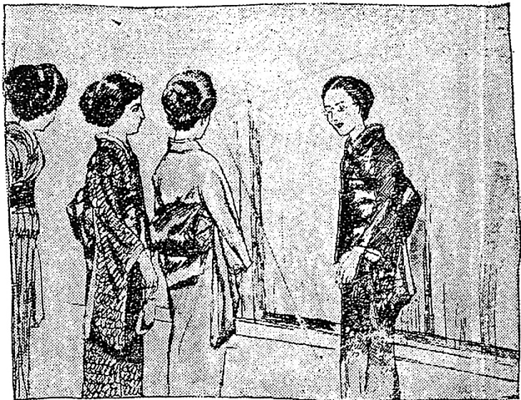 | 説明 | 某婦人団体の歌舞伎座総見の催し。団体の会員は上流階級の夫人たちで、やることがなんでも派手という。きものや帯はこの挿絵からはわからないが、袖は中振袖、髪は束髪であまり大きく膨らましている人はいないが、この四人だけ見てもかなりのヴァラエティがある。女性がやや公的な場に出るとか、ただ楽しみのための外出の機会は、むかしはあまりなかったことなので、着るものはちぐはぐになる。「腰まで模様のある紋付きを着た片山が(……)」とあるのは、晴れがましいときといえばそれは儀礼的、という念があるので、裾模様と紋付のトラウマからから遁(ノガ)れることがむずかしい。訪問服という言葉が現れてすでに年数が経っているのだが、まだ一般的ではなかった。(大丸 弘) |