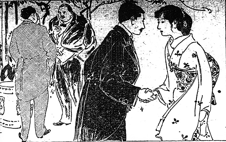 | 説明 | 個人邸でのパーティの一場面。「純日本風に盛装」とはいうものの、髪は束髪で、七三に分けているらしい。作者の江見水蔭個人の感覚かもしれないが、束髪はすでに純日本風の領域に入っていたのか。前割れの束髪は五,六年前までは大胆なものだったが、すでにかなり広がっている。握手という行為は、この時代も日本人同士ではあまり一般的とはいえず、いくぶん子どもっぽいか、諧謔(カイギャク)的な気分でなされたものだろう。(大丸 弘) |