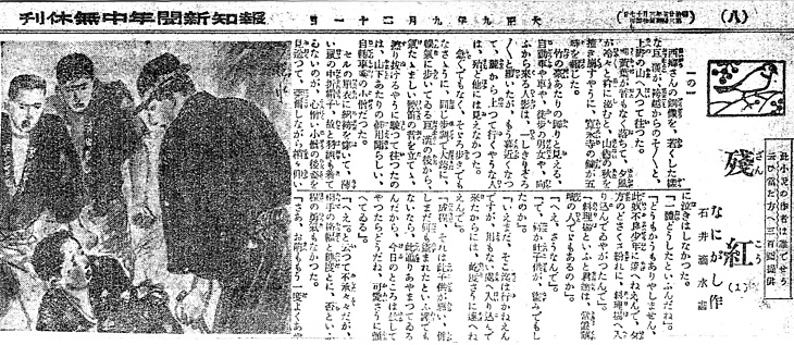 説明 料理屋の調理場に忍び込んだこそ泥少年を、若い者たちが捉えて仕置きをしようとしていたところ、通りかかった男が取りなしている。男の正体は第1回では分からない。「セルの単衣ものに絽袴を穿いて、薄い鼠の中折帽子、わざと羽織も着ていないのが心憎い」。洋杖(ステッキ)には銀の握り、大きな駒下駄には柾目(マサメ)が通っている、とあって、西郷さんの銅像を若くしたようとあるが、身なりは銅像の西郷さんよりだいぶ上等。わざと羽織云々とあるのは、女性からはじまった無用の夏羽織を着ることが、この時代になると男にも波及してきたため。追っかけてきた四,五人の若者というのは板場の連中で、そうでなくても気の荒い稼業、印半天の袖を捲って手荒いことがはじまろうとしている。料理屋の板場――調理場はシェフに当たるハナ板からいちばん下っ端の洗い方まで、位によって仕事が決まっていたが、恰好はみんな職人共通の半纏腹掛け股引に前垂れだった。それが衛生法規がやかましくなるにつれ、白い上っ張りを身に着けるよう要求され、最初はずいぶん抵抗があったようだ。(大丸 弘)