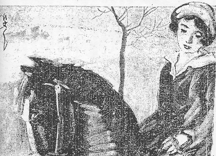 説明 新聞小説のほとんどの読者とは、またおそらく作者の生活ともまったく無縁の世界のはなし。令嬢は母屋とは小半町も離れた離れ屋の寝室で目覚め、化粧室を出ると自分の書斎に入り、侍女が銀の盆に載せて運んでくる朝の飲み物を手にとる――。その書斎の令嬢の着ているものは、第1回の森田ひさしの絵が不明瞭ではっきりしない。たぶん銘仙の縞のきものは分かるとして、その上に花柄の被布をまとっているようでもあり、違うようにも見える。このあと侍女の健康的な美しさに触発されて、令嬢は乗馬服に着替えて馬に乗る。その姿が第2回だが、乗馬姿については挿絵はまったく非説明的だ。「彼女は女性のスポオタアとして日本のような国柄には一寸珍しい程の婦人だった。(……)彼女の天鵞絨の乗馬服が日に輝いた。(……)その丈長い両脚を男乗りに踏ん張っていた。その姿勢は実に佳かった」という本文に挿絵はすこしも添っていない。画家が乗馬服や、あるいは乗馬そのものをまったく知らなかったという、この時代では無理もない理由も想像される。(大丸 弘)