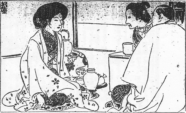 | 説明 | 冒頭にあるように、この物語の発端は日露戦争(1904年,1905年)以前で、この情景も風俗は遡及されているはずである。それにしては娘の束髪が大きすぎるのではないだろうか。その時代は長らく下火だった束髪がまた息を吹き返し、花月巻の流行り出した頃だった。いずれにしろ梳き毛たくさんのこんな巨大な束髪はあと十年も経たなければ出てこないから、熟練の井川洗厓にしてはうっかりミスだろう。その時代ならこの母親のように眉を落とした人はいくらもあったにちがいない。髷も鬢(ビン=横髪)も年相応に小ぶりだが、とりわけ前髪がないと言ってもよいくらい小さく平べったい。これは幕末から1870年代(ほぼ明治10年まで)にかけての流行で、老女はその娘時代のスタイルを守っているのである。(大丸 弘) |