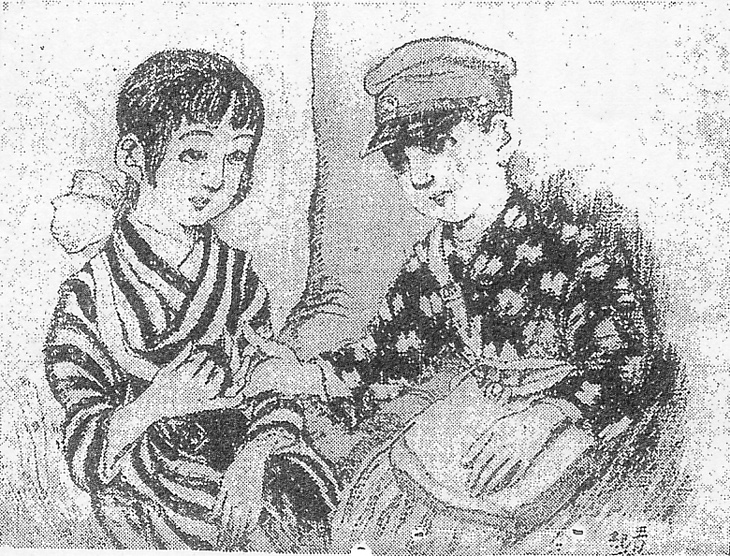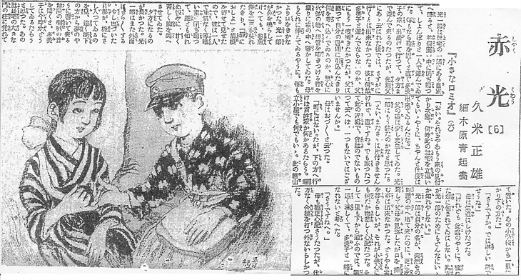 | 説明 | 挿絵の細木原青起はむしろ漫画家として知られていて、なぜここで起用されたのかわからない。途中で若手人気の田中良にバトンを譲り、その後少なくとも大新聞では挿絵に手を染めていない。やがて間を引き離されてしまう仲良しの少年少女を描いているこの日の挿絵では、丹念で手数のかかる描き方だが、男の子も女の子もお人形顔すぎて、子ども絵本のようだ。(大丸 弘) |