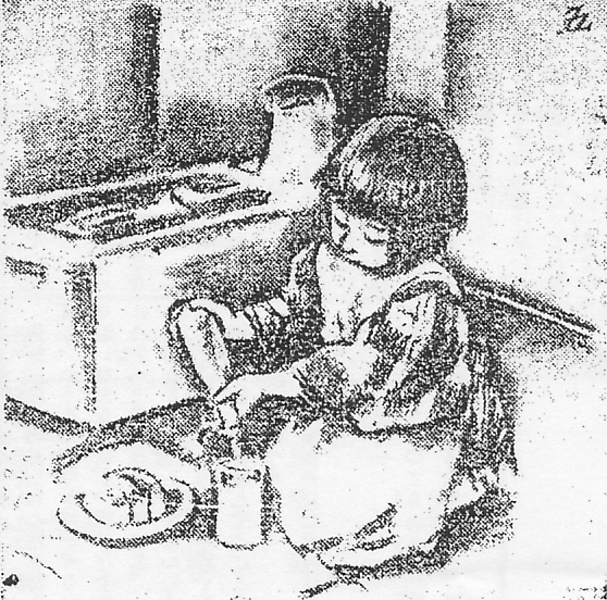 | 説明 | 幼稚園に通うくらいの年頃の女の子。少女のオカッパは、都会ではほぼこの頃に定着した。河童という言い方からわかるように、髪を下ろして切りそろえることは江戸時代からもあった。しかし1920年代の女の子のオカッパには、たしかに断髪の影響があるだろう。女の子の身嗜みにはいくぶんか母親の隠れた自己実現があるから、家庭の幼いモダンガールを、父親も母親も手を打って愉しんだかもしれない。しかし1930年代になると、本人にとってもいちばん始末しやすく、洗うのも簡単で清潔な髪として小学校でも女学校でも推奨されるようになる。第28回では七三分けにしてアイロンを掛けているらしい。アイロンはそう高価なものではなかったので、自分で持っている母親もあったのだ。白いエプロンは汚しざかりの子どもには男女を問わず着せる親がある一方で、いろいろな理由で嫌う親もあったようだ。(大丸 弘) |
