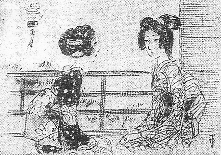 説明 父親に妾がいることを知り、その家まで突き止めた年ごろの娘。大きな耳隠しの洋髪に結って眼の縁を隈どったモダンガールの娘は、そんな父親をおもしろがるだけで、むしろ利用しようという風に頭が回る方。第59回ではお妾さんと、第63回では妾宅で父親と向き合っている娘はほっそりした首が目立ち、ガブリエル・シャネルが若いときのじぶんについて誇っているように、この時代、襟あしの白粉の白さなどより、この華奢な細さ自体がチャームポイントだったことを暗示している。お妾さんは奥様風の島田髷。島田ばかりでなく、囲われものという存在自体がそろそろ古風になりはじめていて、それをまた情緒としてよろこぶ紳士や旦那衆の多かった時代。(大丸 弘)