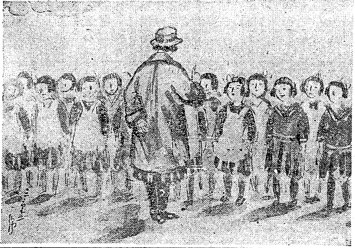 説明 ここに描かれている小学校高学年らしい女の子はみんな洋装で、それも水兵服らしく、たいていの子はその上からエプロンをしている。一人二人お下げらしい子はいるが、だいたいはおかっぱ頭のようで、この時代の大都会の小学生の一般的なスタイルだが、裕福な家庭の多い地区ではあるだろう。少女のおかっぱ頭はこの頃急に多くなり出したもので、大人のボブカットに先行し、断髪などと言っていた。(大丸 弘)