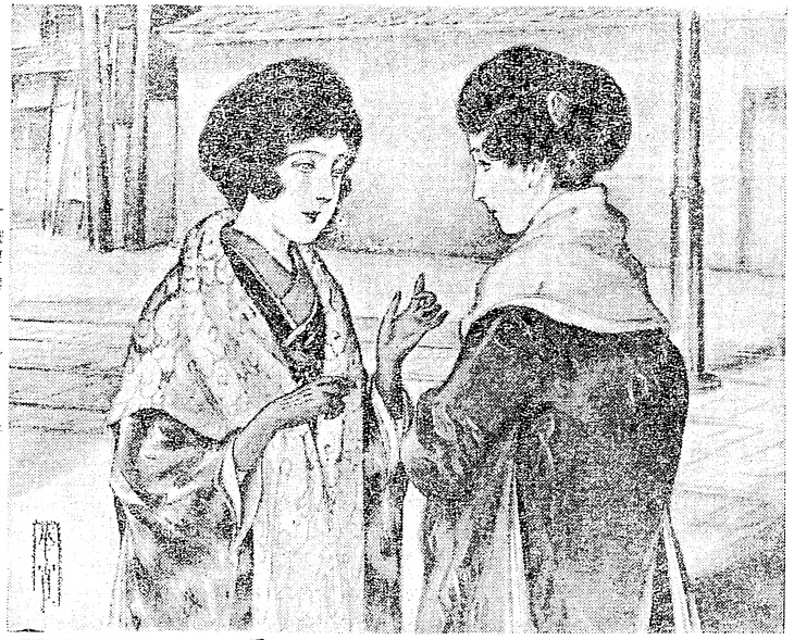 | 説明 | 政界にも絡んだ上流階級の人々の物語。高畠華宵の描く顔はそんな人々にふさわしいようで、またそうでもないようでもある。女性二人はこの頃の、前をあまり出さないで全体を大きめに膨らました束髪を結っている。左側の女性は耳隠し、右の女性は七三分けした三の方の毛を耳の上から後ろに持っていって、けっこう大きい髷をつくり、束髪ピンを挿している。ピンと言っても簪(カンザシ)の一種だ。左の女性でよくわかるように、毛の部分部分をアイロンでカールさせている。最初は欧風束髪、あるいは洋風束髪と呼んでいた。(大丸 弘) |
