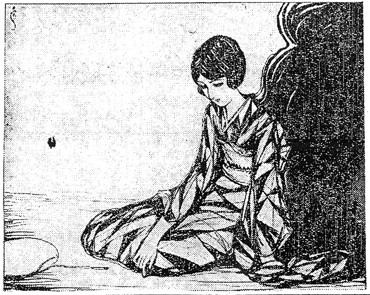 | 説明 | 外出から帰ったままの恰好でこの耳隠しの娘は、「横坐りして、左の手を畳につき、どの指も袂で見えないようにしていた」。小さいときから躾けられて、長時間の正座に慣れていたこの時代の人は、男女とも膝を崩すということは滅多になかった。あぐらよりも、横座りよりも、正座の方が楽だったから。この女性は仲の良い姉にいくぶん甘える気持ちでもあるが、じつはいつも左手に嵌めている指輪の失われたことを、姉に知られたくないための策略なのだった。横座りはしないでも、ものを言うとき、あるいは言いづらいとき、少し身体を曲げて片手を突き、畳に「の」の字を書いたり、けばをむしったりする、というのはよくあるシーン。羞恥心や、ものを言いたくても言えない気持ちの表現として。(大丸 弘) |