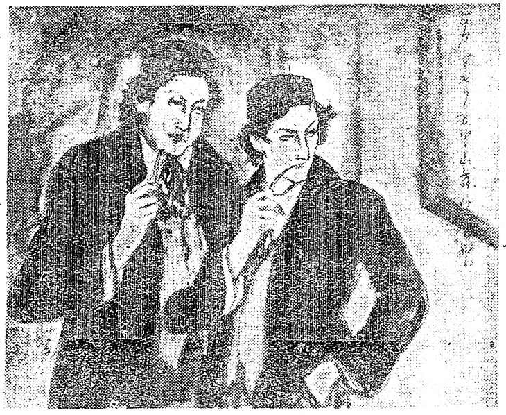 | 説明 | 初日の満員の劇場の中をぶらついている舞台監督と座付き作者の脚本家。「二人は同じ型の黒い天鵞絨の服を着ていた。服の胴にはバンドが付いて居た。二人とも頭の髪を長くして其の頂辺に曲げ物の型をした同じ布地の帽子を載せて居た」と、脚本家が舞台監督をそっくり真似ているため、まったく同じ恰好。左側の大きい方が監督で、大きく広がった派手なウイングタイを結んでいるから、脚本家の方もそうなのだろう。作者の佐藤紅緑は、曲げ物の型をした帽子、と言っているがこれはトルコ帽。ウエストバンドの付いたビロード地のブレザーも、縦縞のチョッキも、無造作風のネクタイも、長髪も、サラリーマンパターンで発展してきた標準的スーツスタイルとはちがう、ヴァガボンド風。とくにこの時代の舞台関係者などには、プロレタリア演劇の関係から、ルバシカ(ルパシカ)などロシア風も見られた。(大丸 弘) |