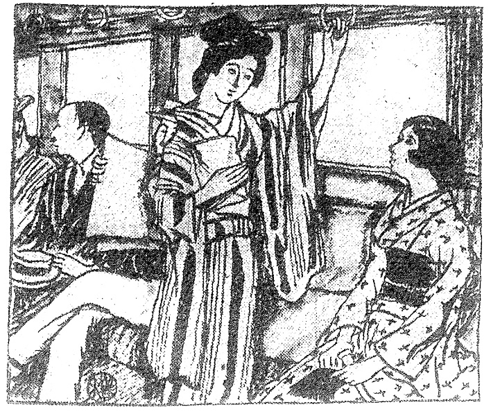 | 説明 | 市電の中で久しぶりに出会った女学校時代の旧友同士。座って見上げている方がヒロイン。断髪風な短い髪で、夏のことだからパラソルを手に、膝の上には小さい包み物を置いている。立っている友人の髪はバックの色と重なってはっきりしないが、本文中で島田、と言っている。丸髷に比べて髷の前方が大きく見えるからそうなのだろう。ヒロインはそれを「一種の安堵で見やった」。結婚指輪が一般的でなかった時代、むかしの友達に会ったとき、もう丸髷になっているかどうかは重要な指標だった。それを嫌って、どっちつかずの銀杏返しにしている女性もあった。夏の単衣物で吊り革につかまっていると、座っている人の目には脇の下まで見えてしまうことがある。そうかと言って、いつも袂をつかんでいるのはうっとうしい。脇毛の処理を勧める美容家の意見が新聞紙上に現れるのはもう少しあとだが、脇毛を気にして抜いている人がいたことは、明治の初めから記録に残っている。(大丸 弘) |