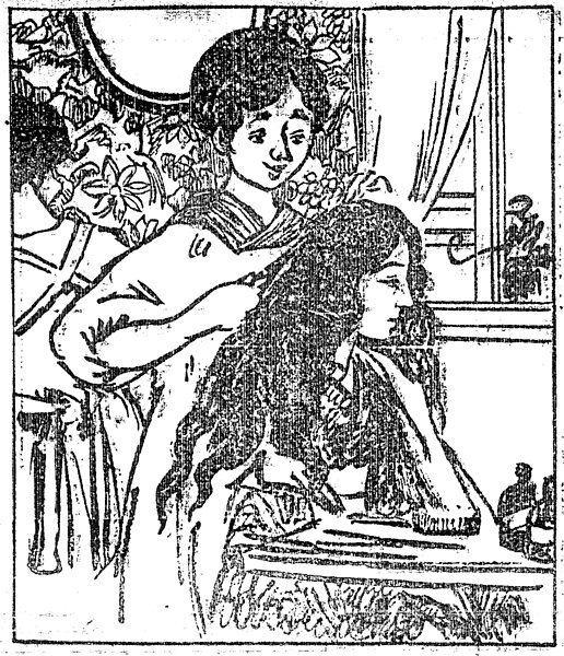 | 説明 | 美容師をヒロインとした作品。美容院の内部や新しい美容技術にも触れているので、作者の里見弴はけっこう勉強したにちがいない。昭和の初め十年間くらいが、それまでの髪結さんが美容師の先生に代わってゆく、両者の並行の段階だった。古い髪結と美容師のいちばん大きな違いは、アイロンを使えるかどうか、そしてその技術力だったろう。この挿絵で美容師はふかしアイロンをしている。アイロンはもちろんウエーブをつけるためが主目的だが、髪を乾かすためや、膨らますためにも便利で、ウエーブは嫌いでもアイロンは使わせる、という客も多かった。(大丸 弘) |