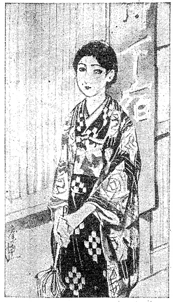 説明 この娘の着ているきものの柄は、ひと言でいえばメリンス(=モスリン)柄である。モスリン友禅は発色がよく、綺麗な色のきものに憧れる若い娘、というより女の子には強い人気があった。そのメリンス柄も、この頃になると明治時代とは比較にならないほど進歩していて、中には大人のおしゃれ着になるようなものさえあった。挿絵の須藤しげるは、お人形顔の、あるいは童画風と言ってもいいような美少女を描いたが、大正中期から昭和のこの時代にかけて、竹久夢二も含めて、そういうタイプの画人が多い。(大丸 弘)