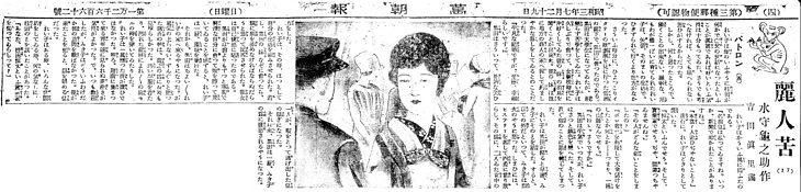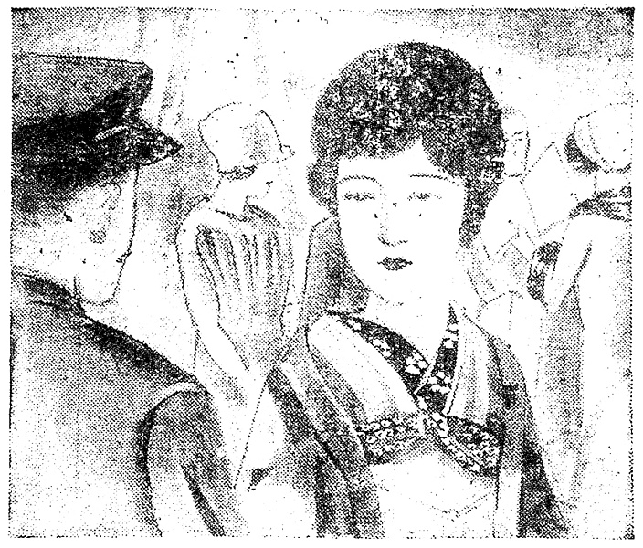 説明 パトロンを持って身分不相応な贅沢をしている女性。同級生の兄がまだ大学生なのだから、彼女もせいぜい二十歳だろう。この時代、この年頃の女性は思いきって胸高に帯を締めたが、帯揚げをここまで強調するのは、あまり上品な趣味とはされなかった。髪は七三の耳隠し、片耳隠しかもしれない。場所はイタリア・オペラ上演の日の帝劇の廊下。背景にギャルソンヌ風の女性が何人か見える。それぞれの目立ち方、華やかさはちがうが、洋装の女性たちとこの和装のヒロインとが廊下を行き交う情景は、美しい見ものだったにちがいない。(大丸 弘)