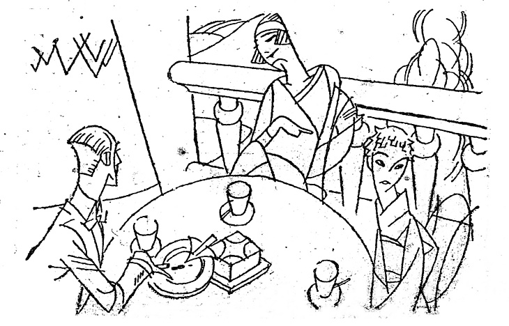 説明 高級クラブの女給(ホステス)がヒロイン。この作品の挿絵を担当した代田収一はいろいろな遊びをしている。陰影をじゅうぶんにつけたかなり写実的な日もあれば、絵というより抽象的な図のような日もある。この日は思いきってアブストラクトな、単純な線で構成している。「女の子は下瞼のきわにやわらかい影をつくって、ごく軽く微笑んで僕を見た」というのがこの場面の説明になるのだが、果たして読者が納得するだろうか。画家の実験はわかるが、ひとつには個々の作画スタイルと本文との対応、もうひとつは、日々の画風の変化が、ストーリー全体の気分に影響するもの、この二点が問題となる。(大丸 弘)