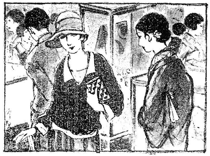 | 説明 | デパートの販売員をしているヒロインに、豊かそうな令嬢が近づき、共通の知人――一人の男性について聞きただしている。ヒロインはこの時代、デパートにかぎらず、販売係や事務員に広く用いられたコート型の上っ張りを着ている。売り場でもオフィスでも和服の人が多かったこの時代、大振りで東コート風のこの仕事着は重宝がられて、戦時中まで続いた。このヒロインの着ているものは袂付きだが、袂のないものが多く、そうすると、きものの袂を袖の中に突っ込むと袖が重くなって、その点が不具合だと言われた。彼女はおとなしい、ということは、小さめの束髪に結って、耳の後ろに造花を飾っている。耳隠しはそろそろ飽きられだしていた。第81回の休憩室のソファの令嬢は脚を組んでいて、短いスカートが膝より上に吊り上がり、下のシュミーズの縁レースがかなりのぞいていて、お行儀が悪い。これは二人の関係、とくに令嬢の感情を暗示している。このころは洋装の下に着るものは、すべてシミーズ、という呼び方をするのがふつう。だからこういうのをシミチョロと言った。(大丸 弘) |