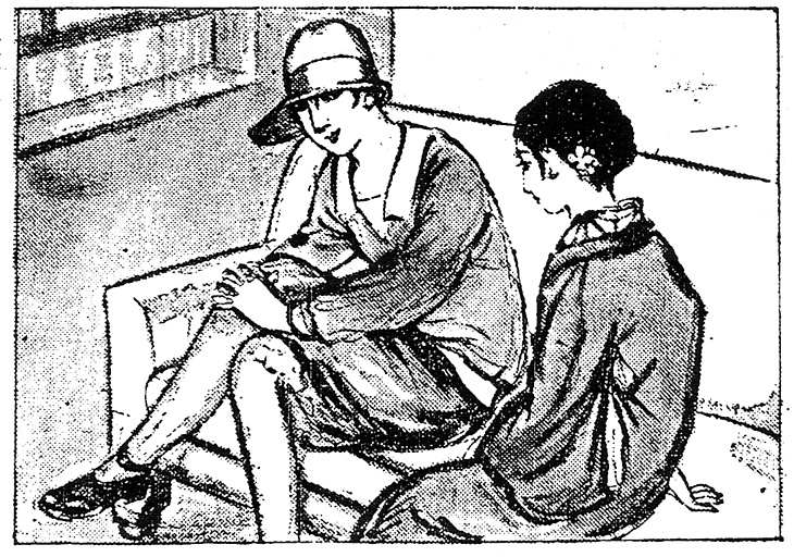 | 説明 | デパートの販売員をしているヒロインに、豊かそうな令嬢が近づき、共通の知人――一人の男性について聞きただしている。ヒロインはこの時代、デパートにかぎらず、販売係や事務員に広く用いられたコート型の上っ張りを着ている。売り場でもオフィスでも和服の人が多かったこの時代、大振りで東コート風のこの仕事着は重宝がられて、戦時中まで続いた。このヒロインの着ているものは袂付きだが、袂のないものが多く、そうすると、きものの袂を袖の中に突っ込むと袖が重くなって、その点が不具合だと言われた。彼女はおとなしい、ということは、小さめの束髪に結って、耳の後ろに造花を飾っている。耳隠しはそろそろ飽きられだしていた。第81回の休憩室のソファの令嬢は脚を組んでいて、短いスカートが膝より上に吊り上がり、下のシュミーズの縁レースがかなりのぞいていて、お行儀が悪い。これは二人の関係、とくに令嬢の感情を暗示している。このころは洋装の下に着るものは、すべてシミーズ、という呼び方をするのがふつう。だからこういうのをシミチョロと言った。(大丸 弘) |