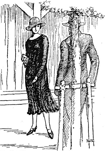 説明 東京に住む白人――新聞をにぎわせた「不良外人」といわれる連中と、その愛人になっている日本人女性たち。作者の沖野岩三郎はキリスト教の牧師作家だが、幅広い分野の作品があり、この作品は昭和初期の世相の断面を切り取った風俗小説。東京駅丸の内南口の中央郵便局建設工事現場に近い道路、颯爽と立っているヒロインの顔も姿も日本人には見えない。そういえばシルエットだけだがプラタナスの樹に凭(モタ)れている男も同様。丸ビルの隣に建築中の中央郵便局前のペーブメント。「パナマの下から魅力に富んだ二つの瞳がこちらを見詰めている。黒のジョーゼットの訪問着のすそを軟らかい風が媚びるように撫でている。靴のエナメールが宝石でもちりばめてあるように、きらきら光る」というのがヒロイン。パナマというのはもちろん素材のことで、しかしたいていは麦藁などでつくるブリムの広い日除け帽。本物のパナマとなれば安いものではない。腕や足元の透けて見えるジョーゼットや透綾(すきや)、明石などには、かなり大胆なものもあって、警視庁は再三警告を発している。訪問着という言い方は現在では和服だけだが、この言い方が使われだした1910年代からこの時代までは、和洋服ともに、訪問着、訪問服、社交着、社交服、外出服など、ちょっとしたおしゃれ着を呼んでいた。颯爽とポーズした、日本人離れしたスタイルのこの人物は、丸の内辺のペーブメント上という舞台の、出演者として描かれている。(大丸 弘)