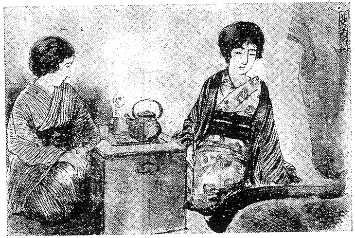 | 説明 | 芸者から女優に転身して成功した主人公だが、芸者時代につくった莫大な負債に追われて、相変わらず家で客を取らなければならない。このヒロインは芸者上がりということで格別だが、そうでなくても、女優を娼婦並みに見る目は執拗だった。長火鉢を前に、やや幅の狭い黒繻子の帯を胸高に締め、きものの上に黒襟の掛かった半纏を、少し肩からずり下げて引っかけた恰好は、さすがに仇っぽい。髪は第14回と第15回とで少しちがって描いてしまったが、中央分けの耳隠しらしい。訪ねてきた女将も同じような髪型。着るものに襟をつけるというのは、もちろん東京の下町風のありふれた風俗なのだが、昭和も5(1930)年のこのころになると、もうそれが、路を歩くと振り返られる、ひとつの江戸趣味と受け取られるようになっていただろう。(大丸 弘) |