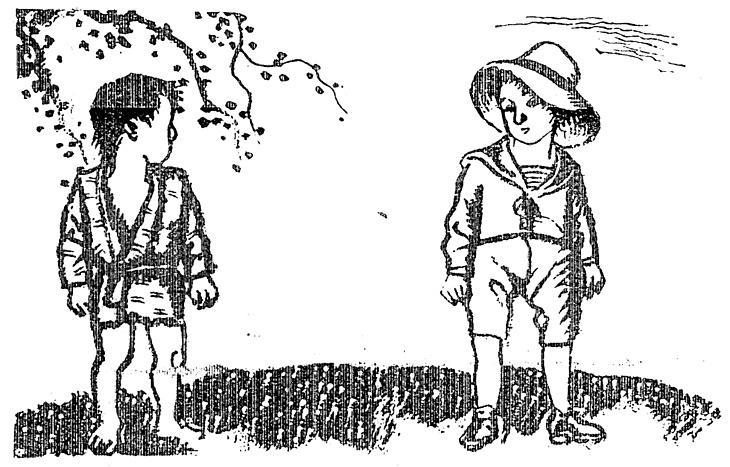 説明 百姓の小倅(コセガレ)と、東京から遊びに来た坊ちゃん。1931(昭和6)年,1932(昭和7)年になると、大都会ではもう、普段きものを着て遊んでいる子は見られなくなった。1920年代後半(大正後半)に都会では、津波のような洋服への切り替えがあったため。終戦後、近郊農村に買い出しに行った都会人が、まだ継ぎだらけのきものを裾みじかに着ている田舎の子を見てめずらしがったもの。農山村に生活する者から見ると、単に貧しさだけのことではない。洋服が活動的、というわけが理解できない。洋服が田舎の子のきものに比べてどんなに窮屈か、見るだけでわかるではないか。洋服は活動的かもしれないが、身体の自由はどちらか優っているかは議論が分かれる。子どもにとってはどっちがいいだろうか。(大丸 弘)